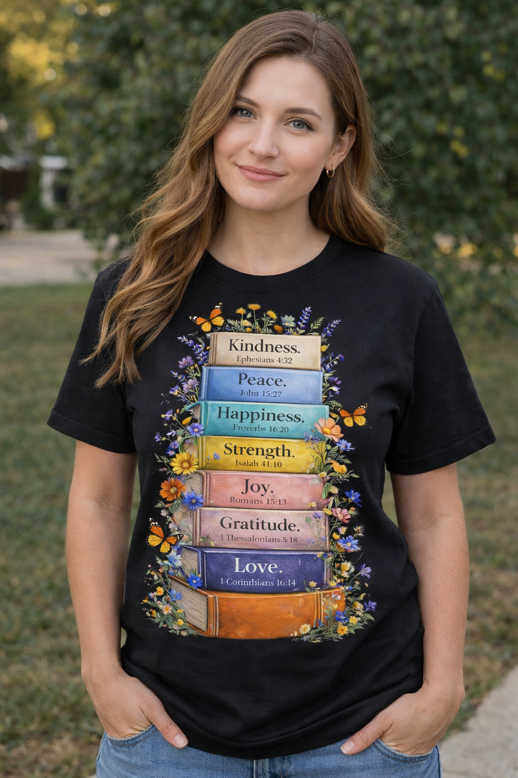 Christian Books of the Bible Values Shirt – Kindness Peace Joy Love Scripture Tee – Faith Floral Stack Design – Inspirational Christian Gift for Women