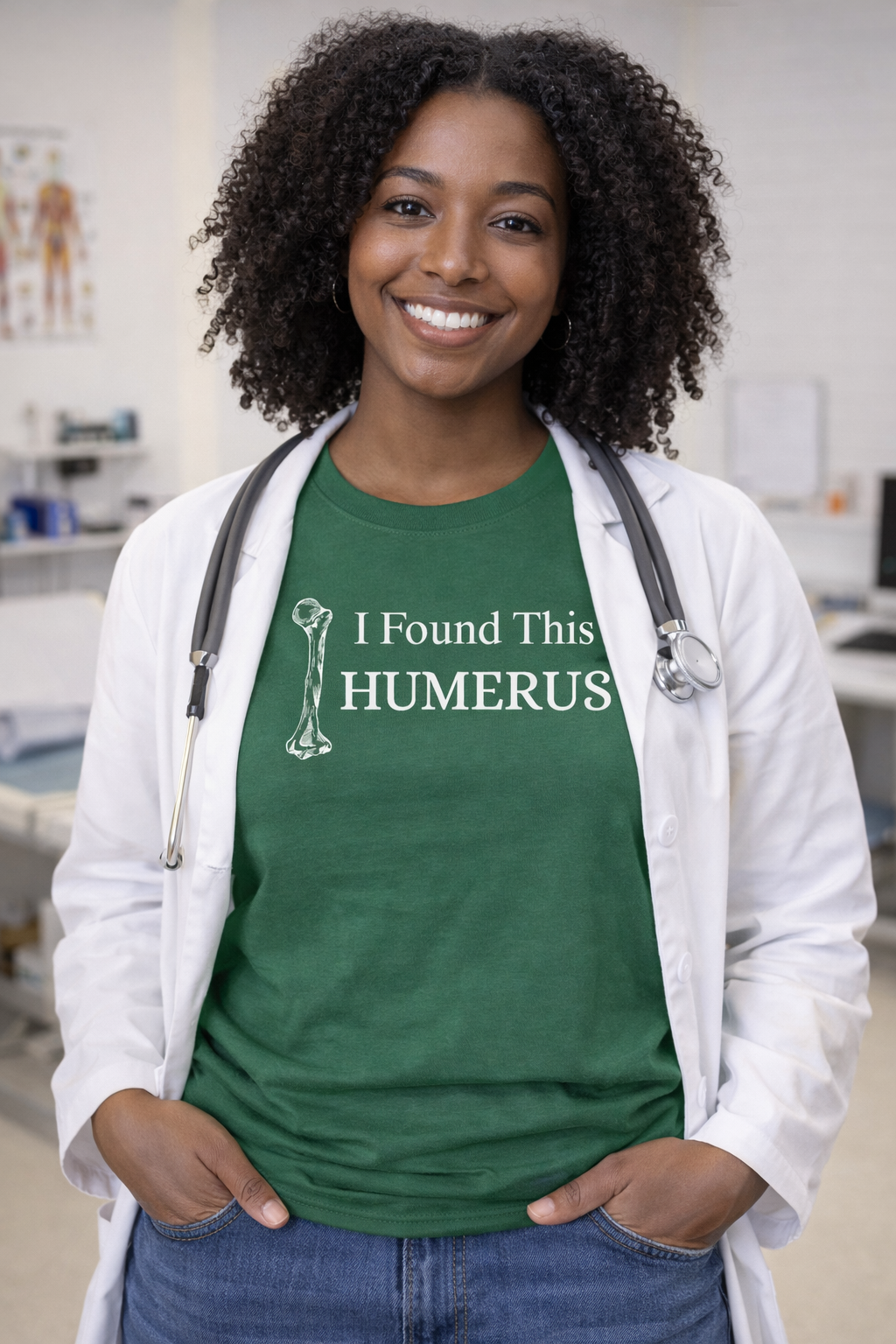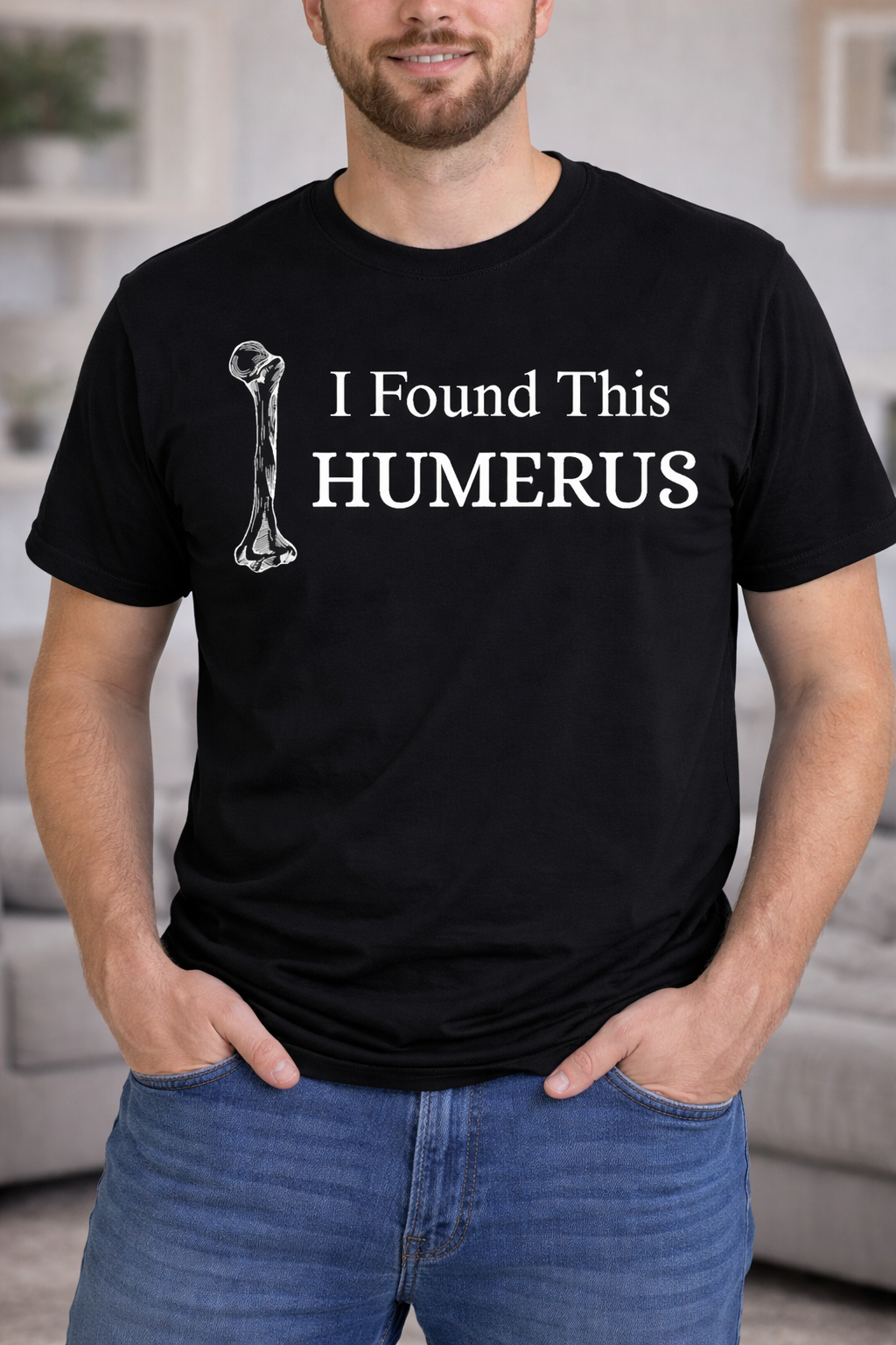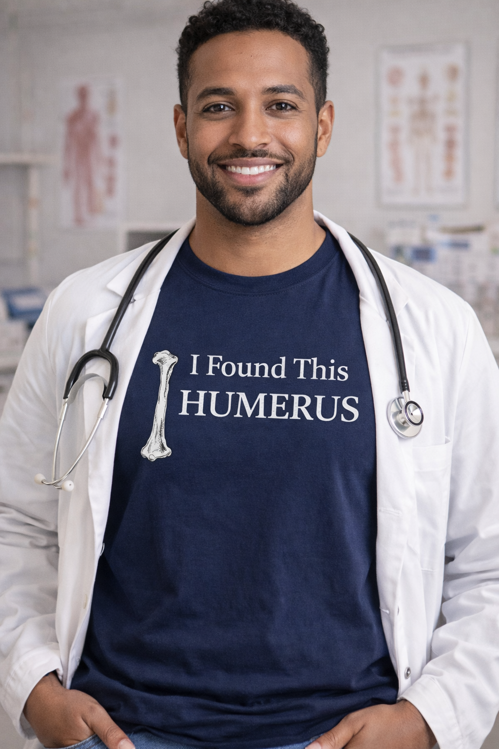 The “I Found This Humerus” t-shirt features a clean typography design paired with a detailed humerus bone illustration — a clever anatomy pun that never gets old. It’s the perfect mix of subtle, nerdy, and funny without trying too hard.