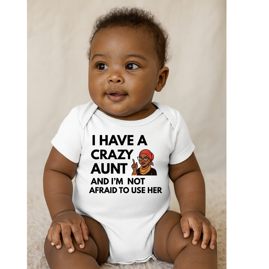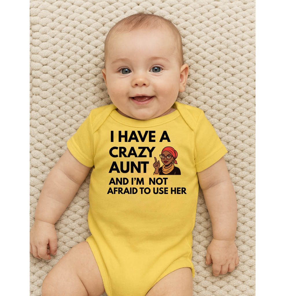 Let your little one make a statement with this “I Have a Crazy Aunt and I’m Not Afraid to Use Her” baby bodysuit! Perfect for babies with strong personalities and even stronger aunts, this fun and playful design is guaranteed to get laughs and compliments.