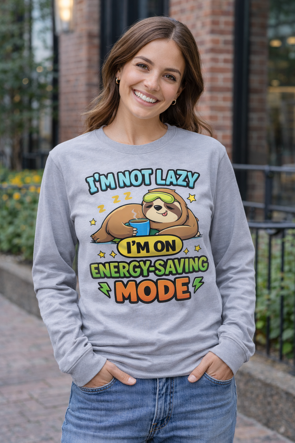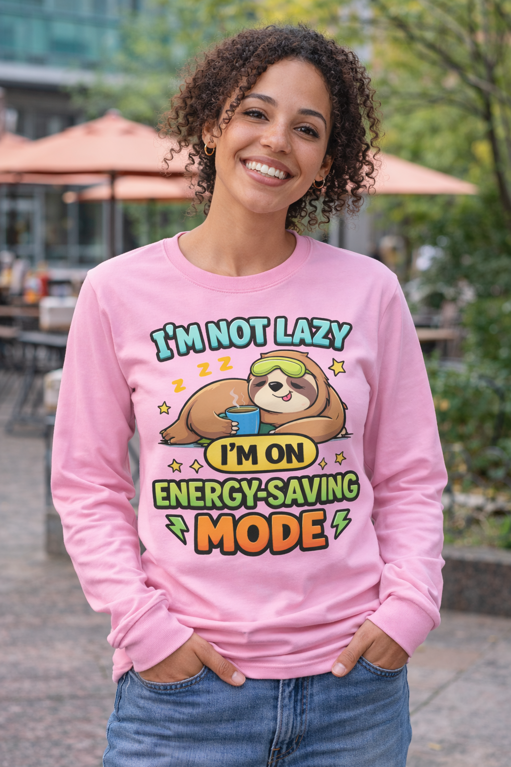 The “I’m Not Lazy, I’m on Energy-Saving Mode” long-sleeve shirt is the perfect mix of comfort and comedy. Featuring a playful sloth graphic and bold, colorful lettering, this shirt says exactly what everyone’s thinking — with a smile.