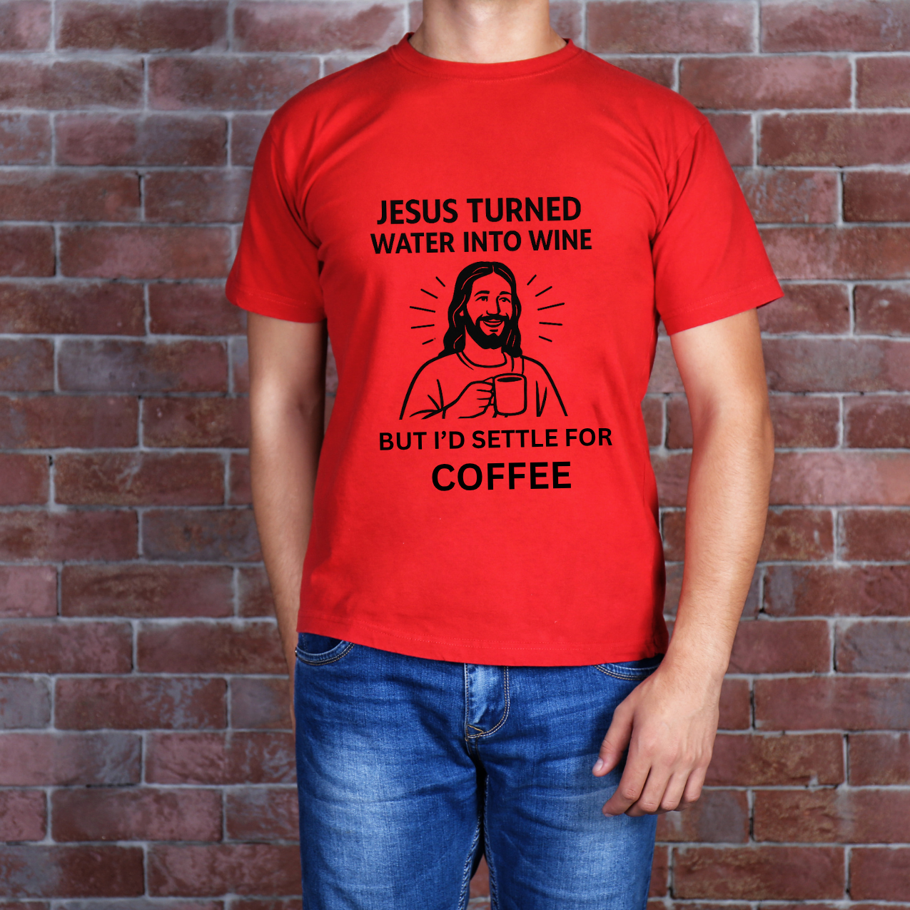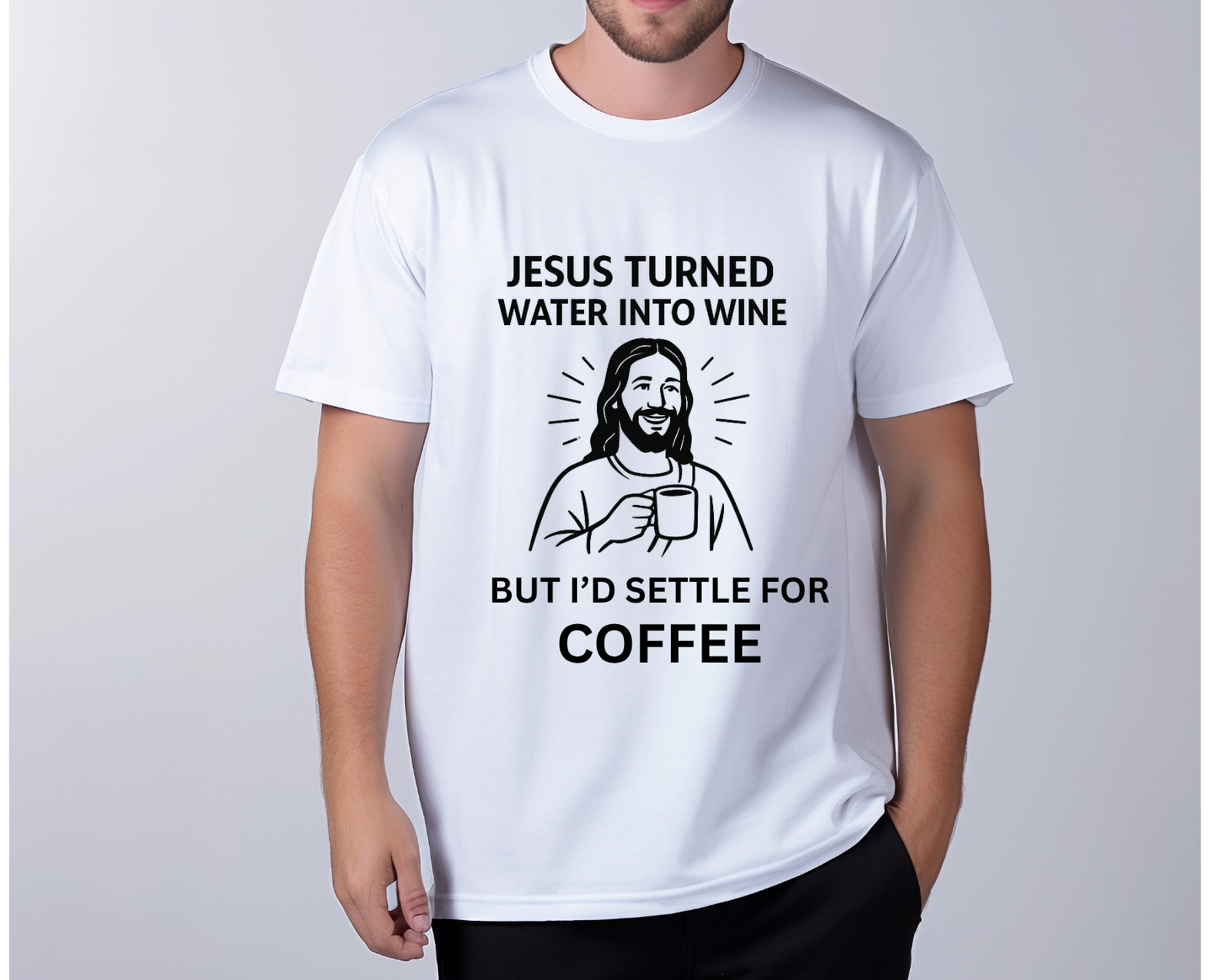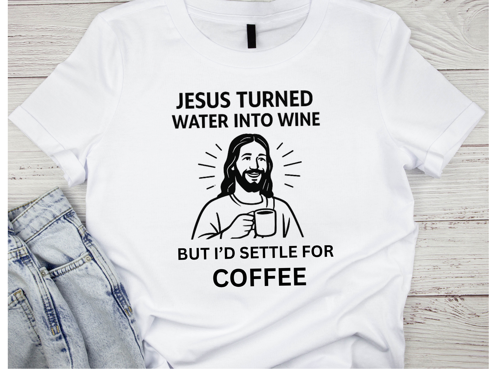 Jesus Turned Water Into Wine But I’d Settle for Coffee” T-Shirt