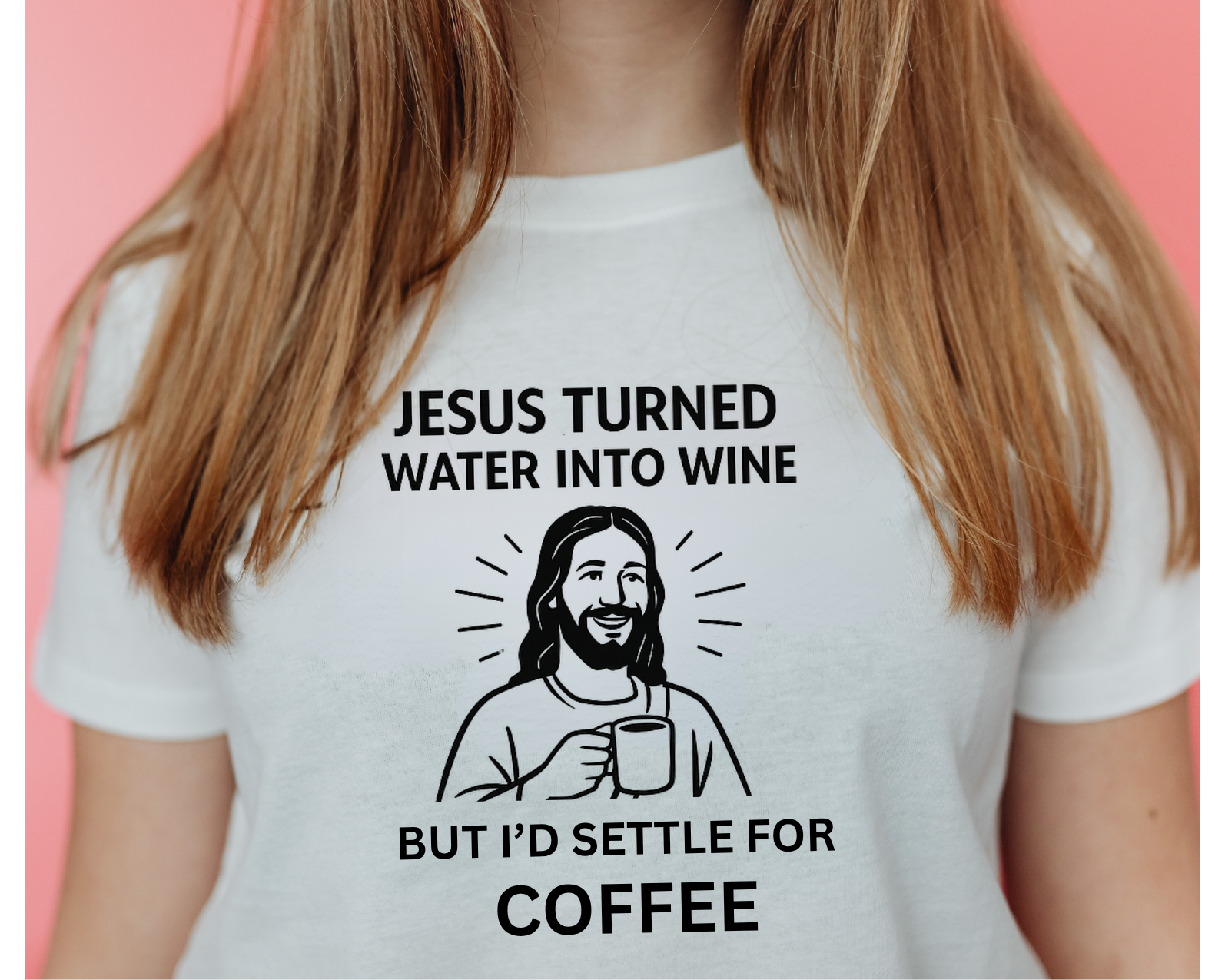This “Jesus Turned Water Into Wine But I’d Settle for Coffee” T-shirt is perfect for believers who love Jesus… but also really love their morning brew.