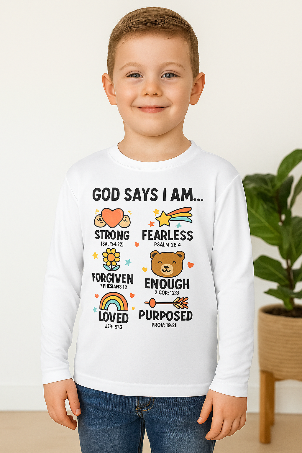 Give your child a boost of confidence and faith with this “God Says I Am…” Youth Long Sleeve Performance Tee. Designed for comfort, durability, and daily encouragement, this shirt features bright, kid-friendly illustrations paired with powerful Bible affirmations — reminding them they are Strong, Fearless, Forgiven, Enough, Loved, and Purposed.