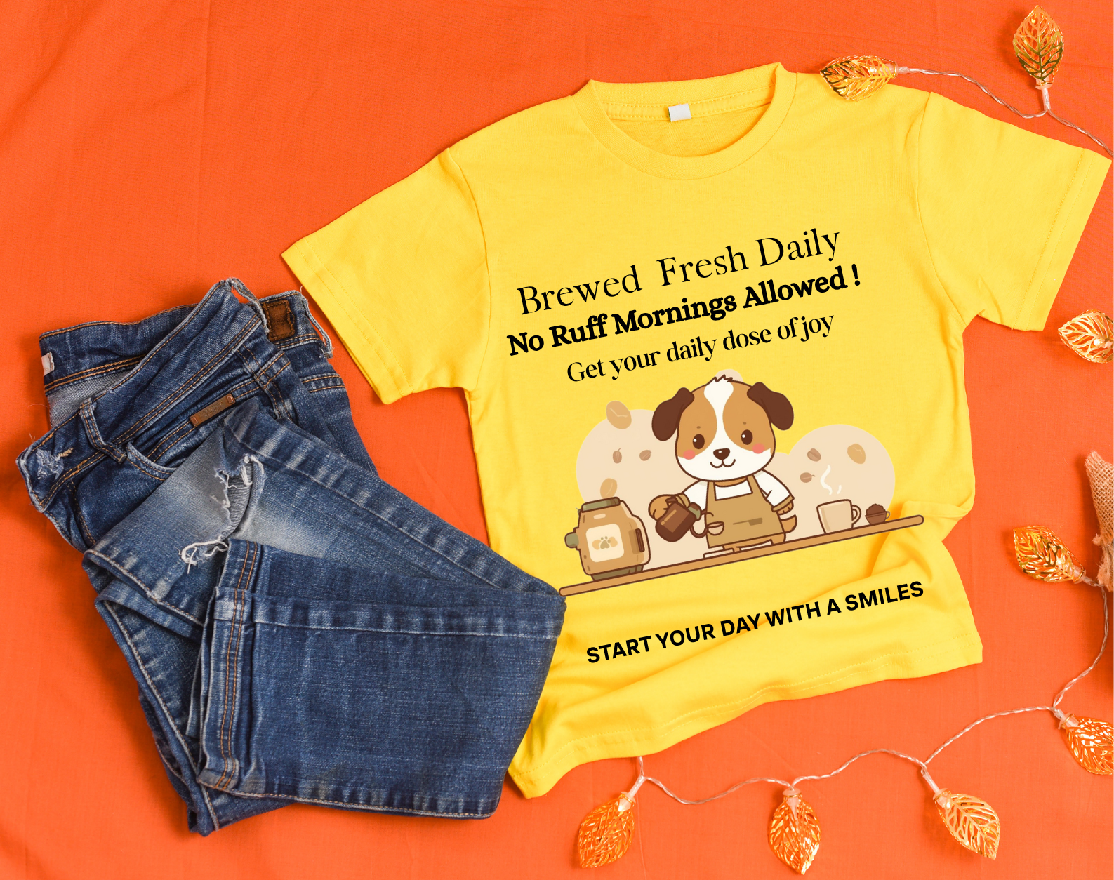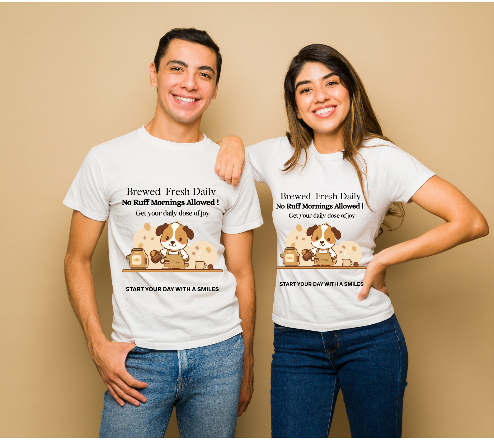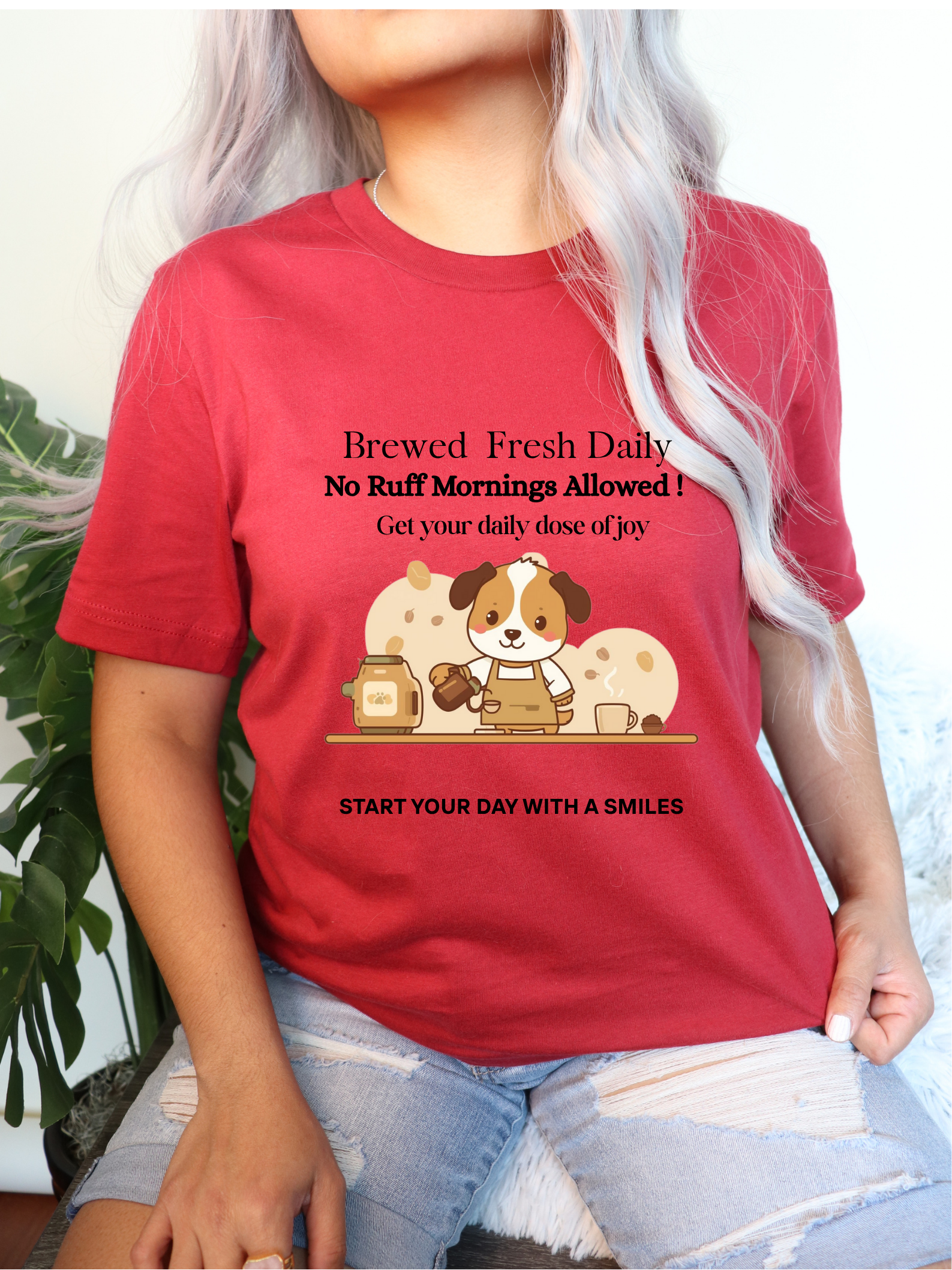 This “Brewed Fresh Daily – No Ruff Mornings Allowed” shirt is the ultimate tee for dog lovers who know mornings are better with a hot cup of coffee and a wagging tail.