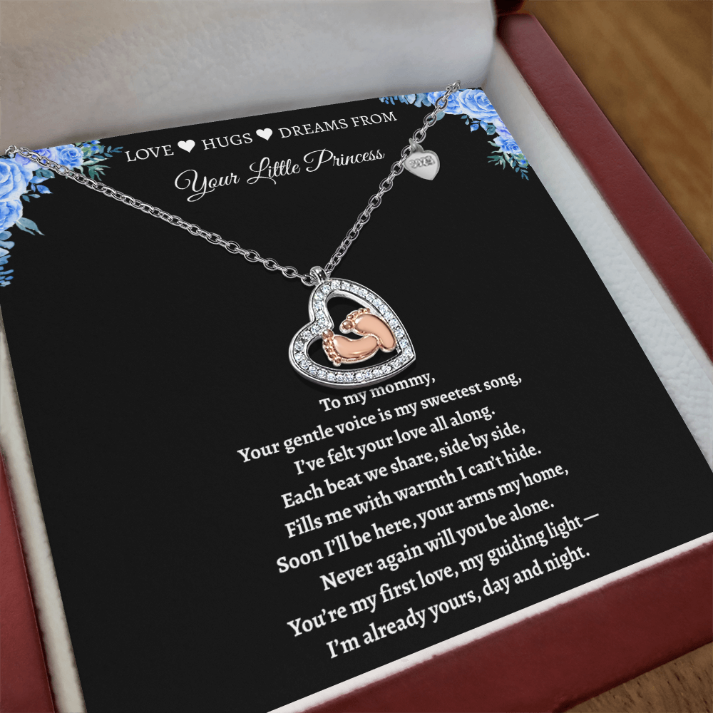 Imagine her reaction receiving this heartfelt symbol of love, family, and precious beginnings. The Baby Feet Heart Necklace features a sparkling heart-shaped frame adorned with shimmering cubic zirconia, surrounding a delicate pair of rose gold baby feet. A touching tribute to motherhood and new life, this necklace is the perfect way to celebrate a new mom, a cherished child, or a growing family.