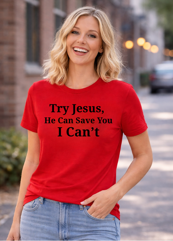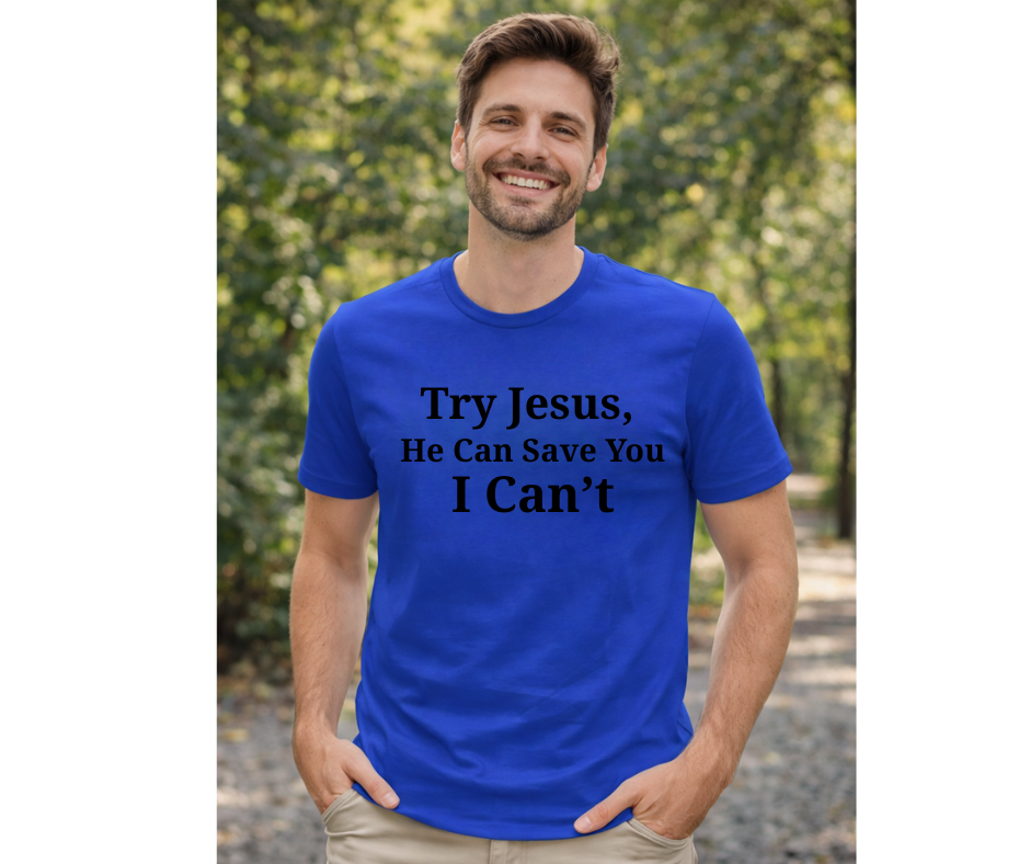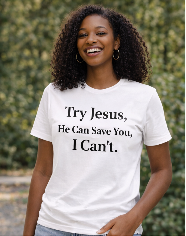 This funny Christian shirt features the bold phrase “Try Jesus. He Can Save You. I Can’t.”